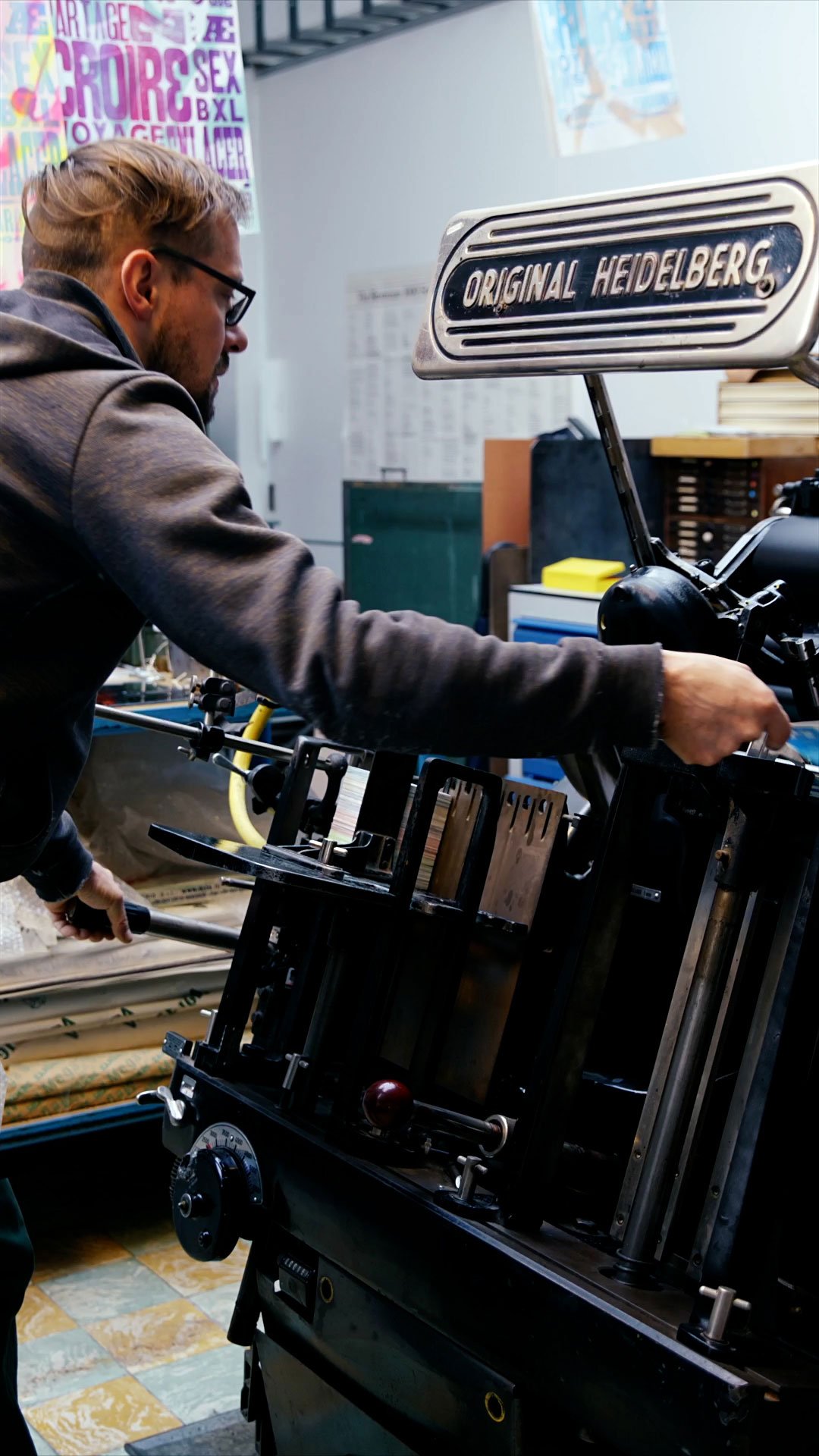 C’est au détour d’un rouleau d’encre et d’une presse Heidelberg qu’il tombe définitivement amoureux de la typographie artisanale — ce mélange d’huile, de métal et de précision qui transforme le papier en matière sensible.